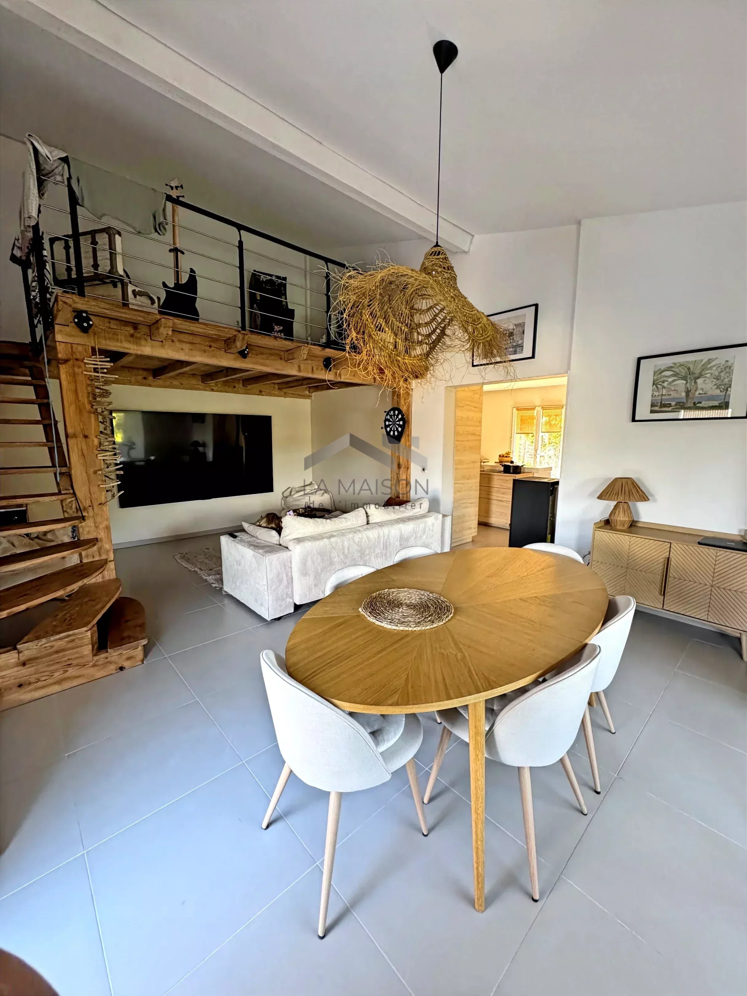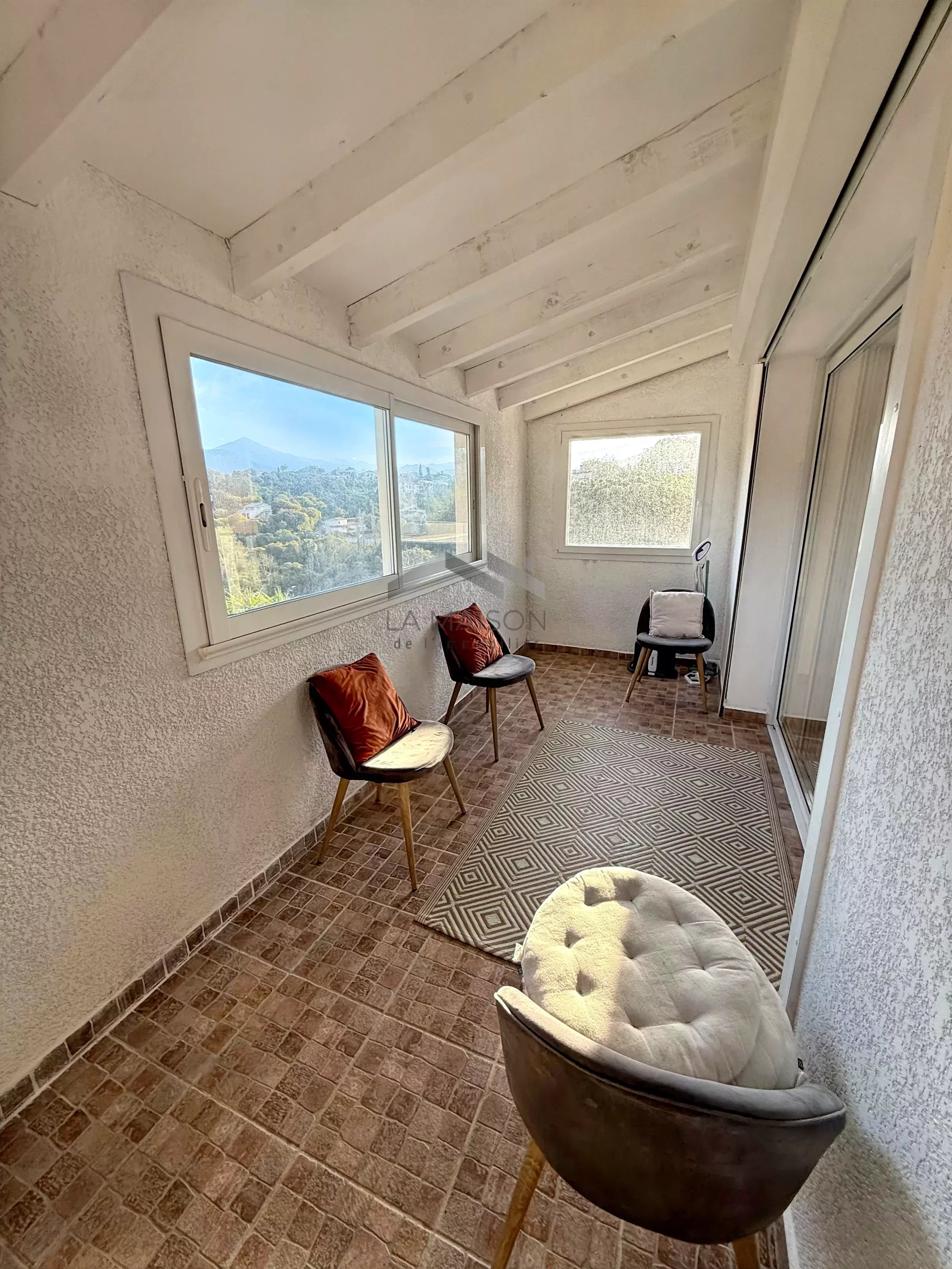 L'appartement principal, situé en rez-de-chaussée, d'une surface de 142 m², comprend un salon-séjour avec mezzanine, une véranda et une terrasse avec vue dégagée, 3 chambres, une salle de bains avec douche et toilettes, des toilettes indépendantes et une grande cave.