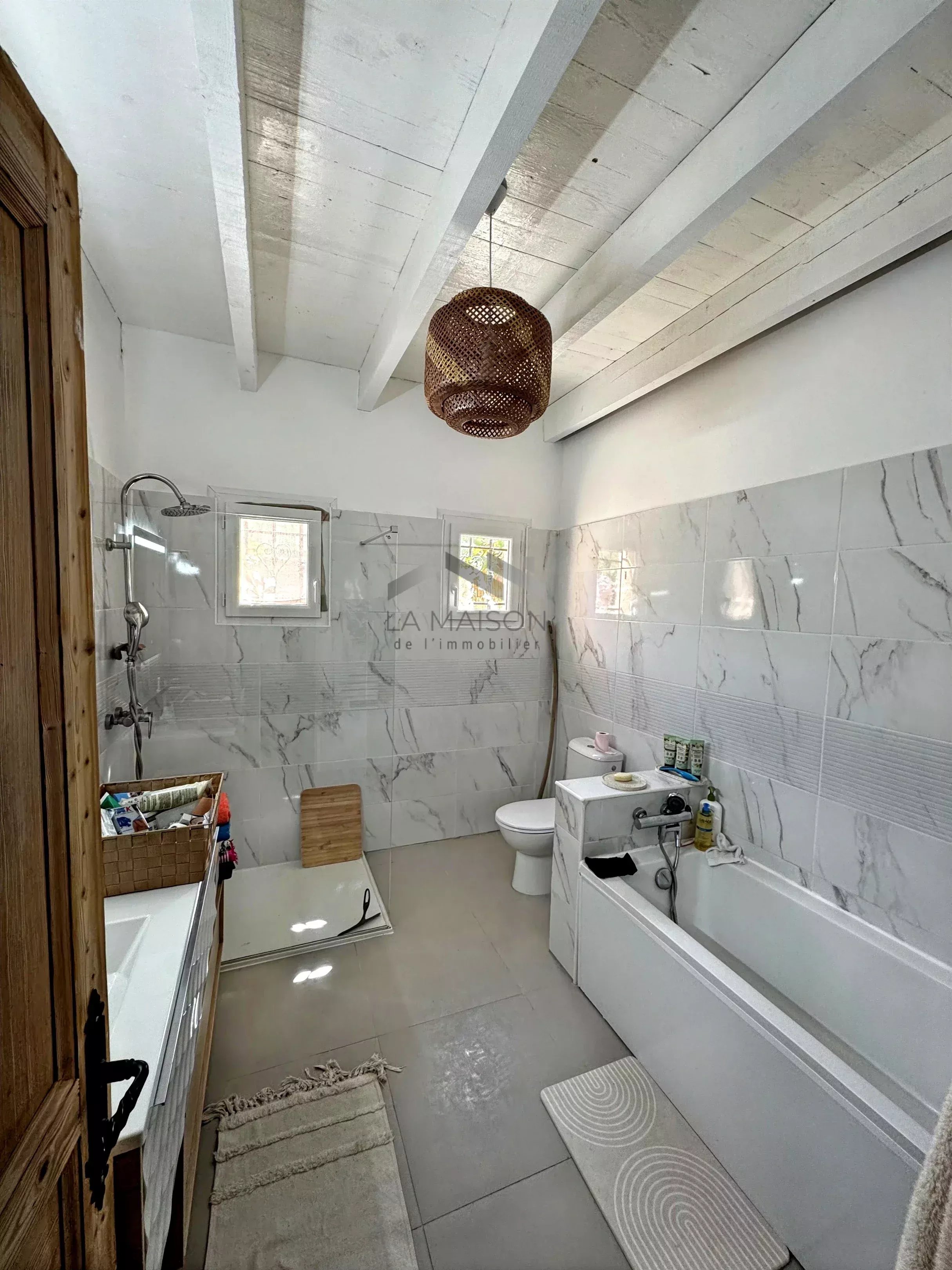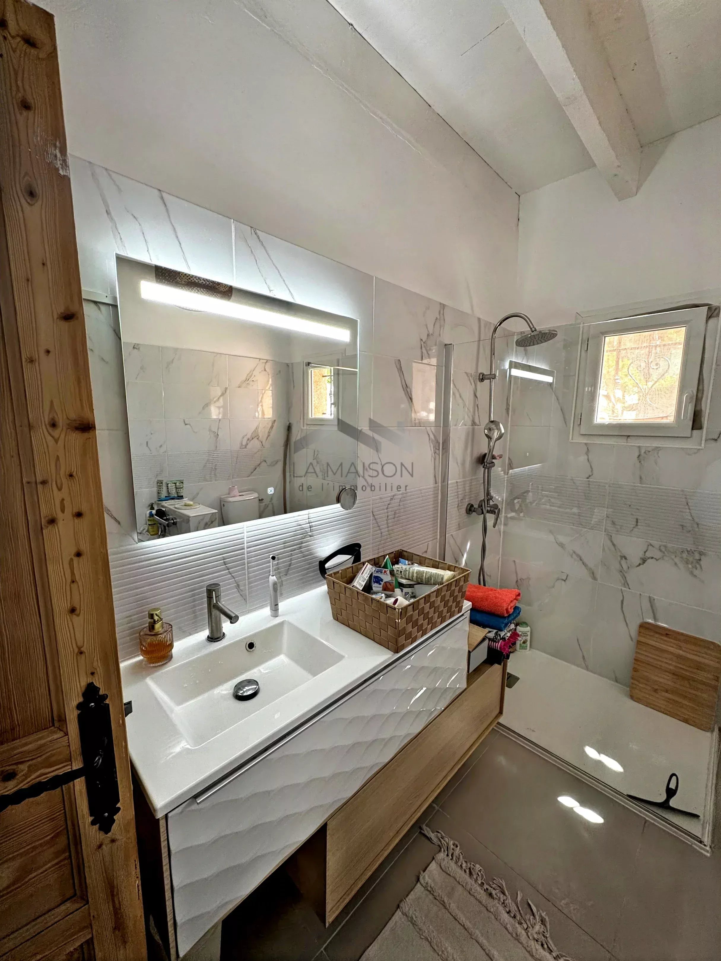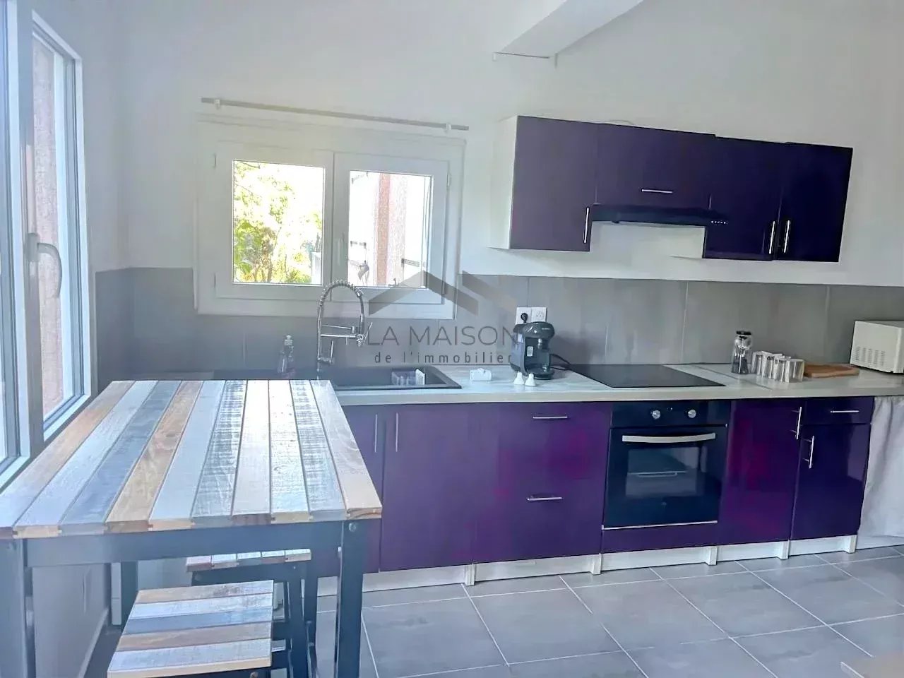 Les menuiseries sont en aluminium à double vitrage. Le chauffage de l'appartement principal se fait par poêle à granulés, climatisation réversible et radiateurs électriques; le chauffage des autres logements par convecteurs électriques.