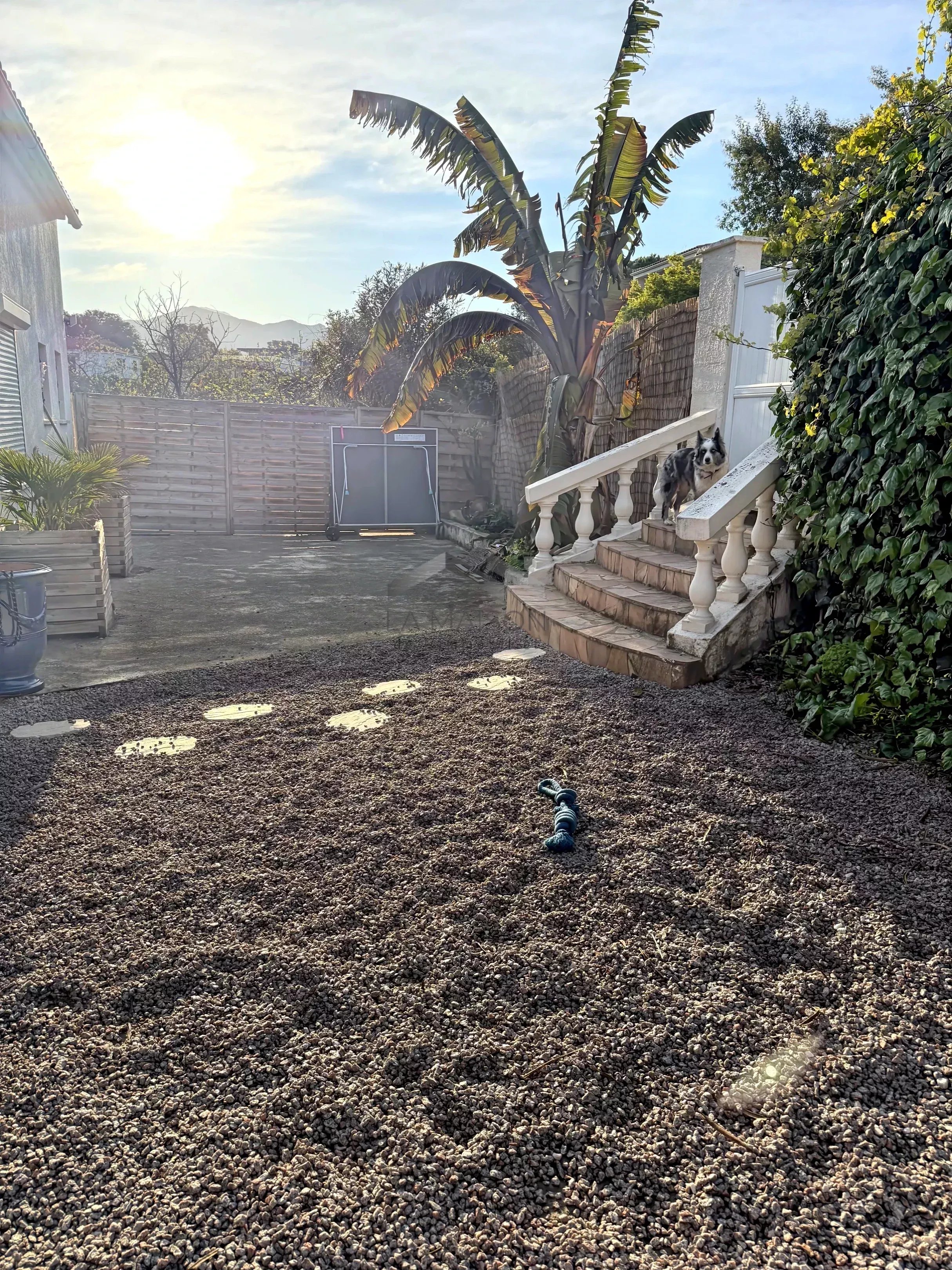 L'ensemble de la propriété est clôturé et dispose de deux entrées : l'une pour accéder à l'appartement principal en rez-de-chaussée, et l'autre pour accéder aux autres appartements situés en rez-de-jardin.