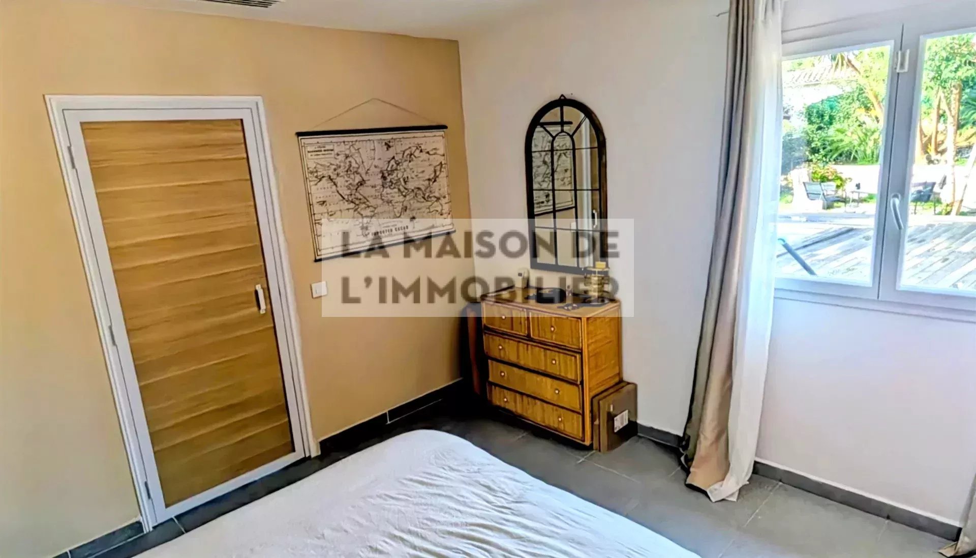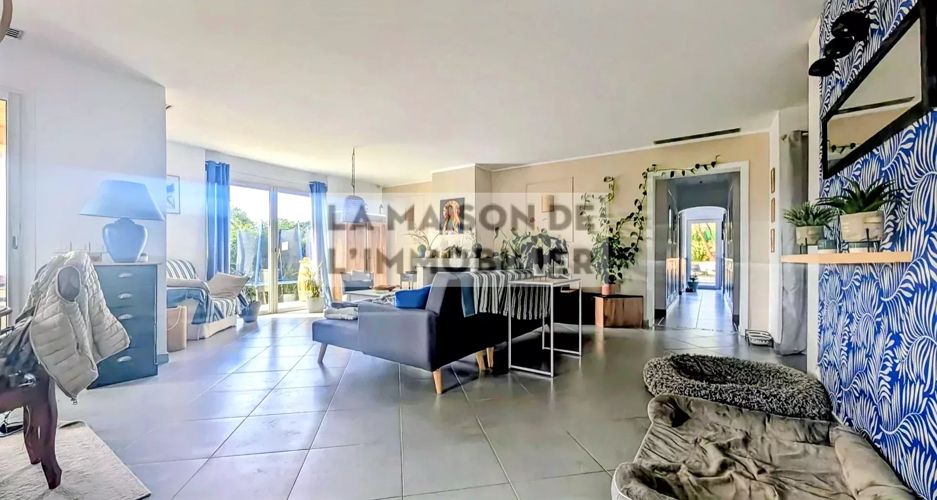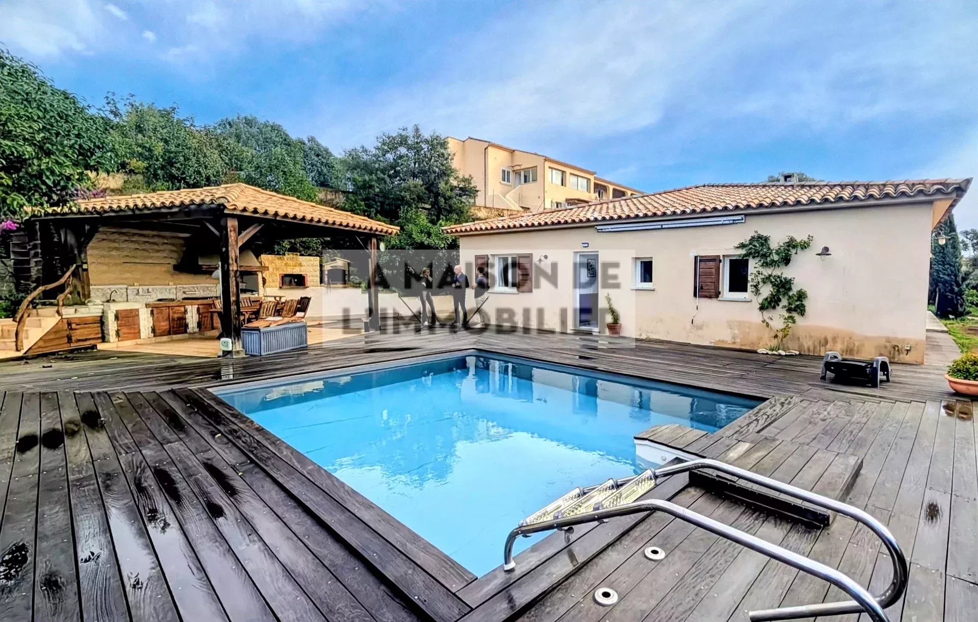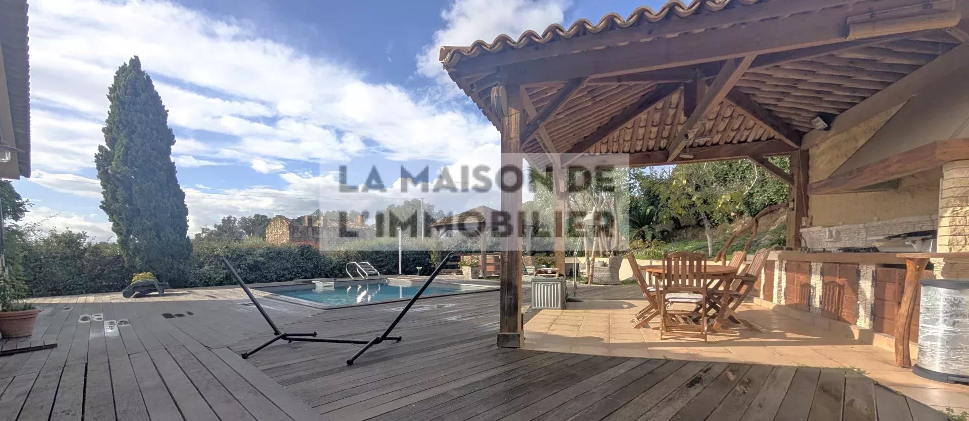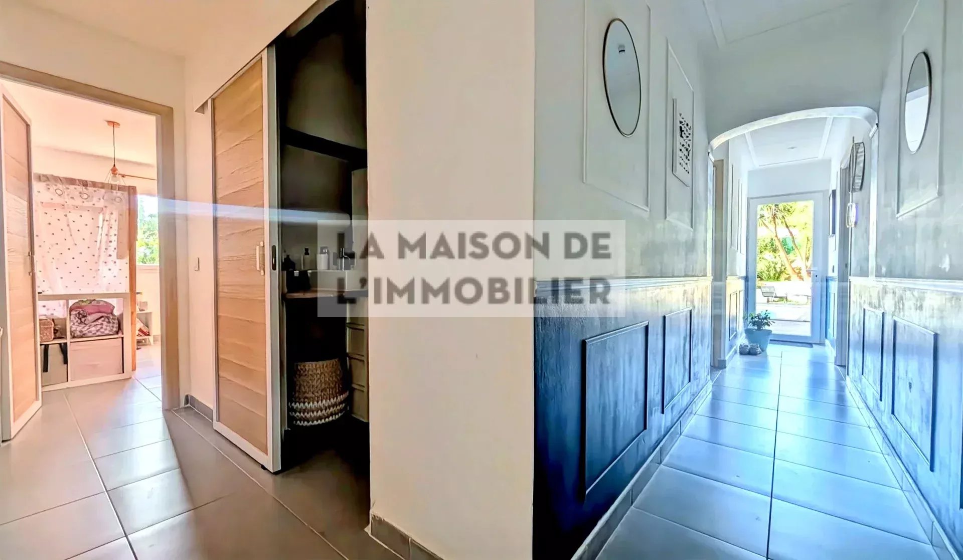 Cette habitation aménagée avec goût, dispose d'un grand espace séjour, salon, cuisine équipée, d'une loggia, d'un cellier, de trois chambres avec de grandes penderies, dont une chambre avec salle d'eau, de deux cabinets de toilette, d'un garage compris dans le volume du bâti et pouvant être facilement aménagé en pièce supplémentaire, d'une piscine avec terrasse et d'une cuisine extérieure couverte et équipée.